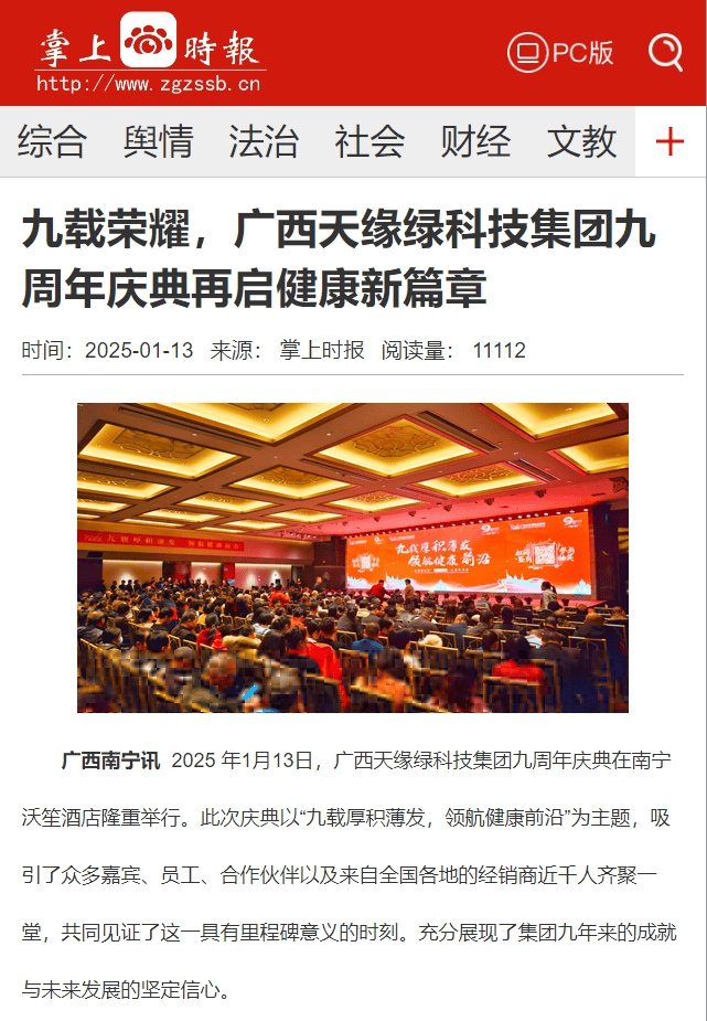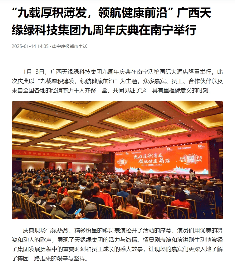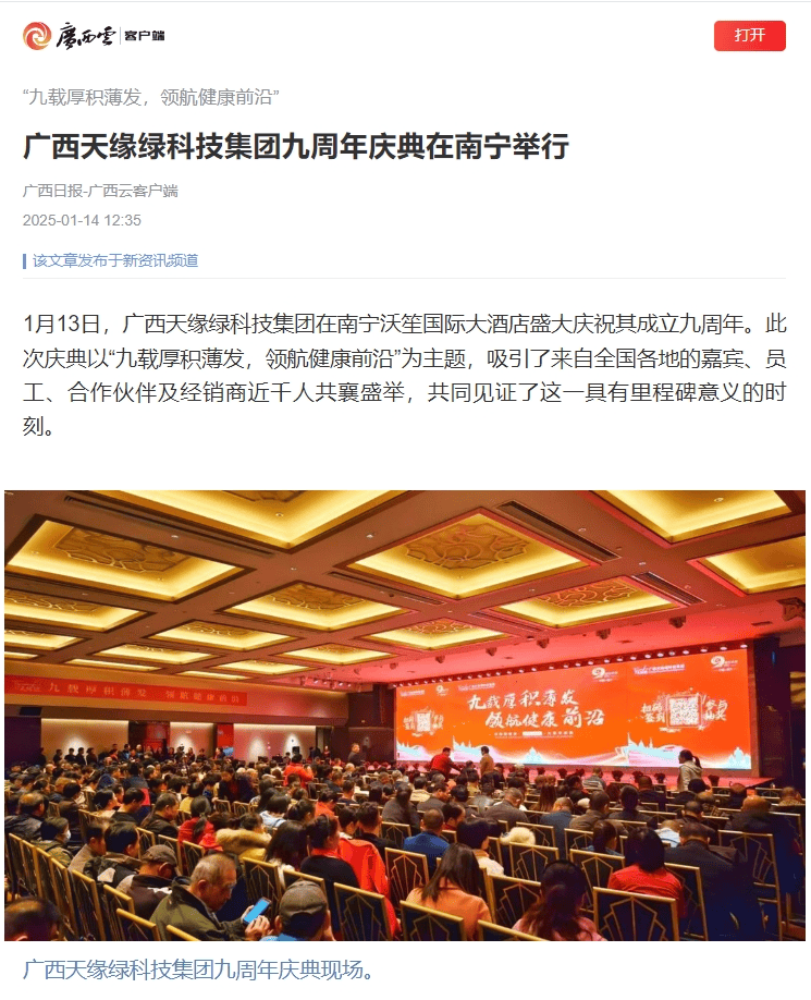 媒體爭相報(bào)道,不僅是對(duì)天緣綠集團(tuán)九周年慶典的關(guān)注,更是對(duì)集團(tuán)未來發(fā)展的期待與鼓舞。站在新的起點(diǎn)上,天緣綠集團(tuán)將不忘初心,砥礪前行,以更加飽滿的熱情和更加堅(jiān)定的步伐,領(lǐng)航健康前沿,續(xù)寫新的輝煌篇章。