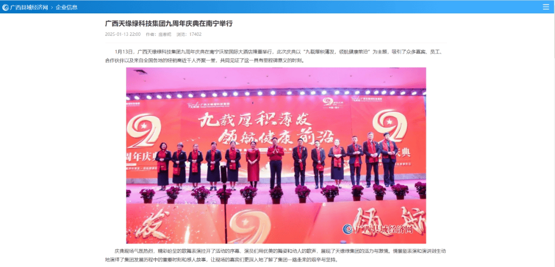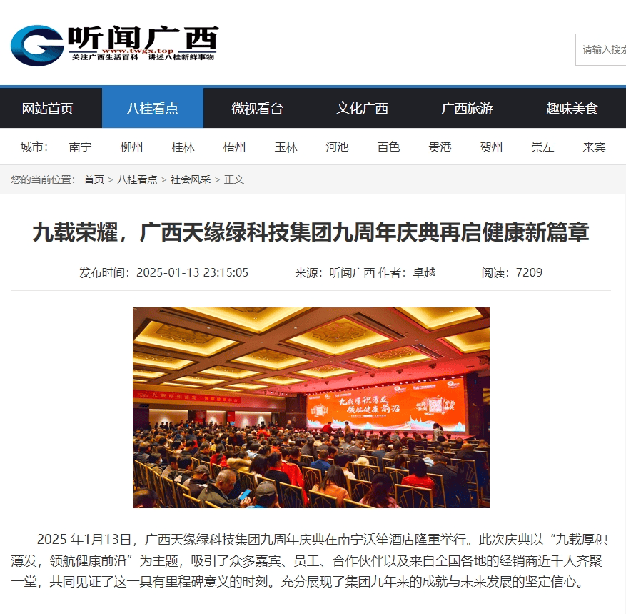 慶典盛況空前,南國早報(bào)、聽聞廣西、東盟新聞周刊、中國報(bào)道、東盟頭條、掌上時(shí)報(bào)、廣西縣域經(jīng)濟(jì)網(wǎng)等三十多家新聞媒體紛紛聚焦此次慶典,競相報(bào)道這一健康產(chǎn)業(yè)的盛事。媒體記者們用鏡頭捕捉每一個(gè)精彩瞬間,用筆觸記錄每一份感動(dòng)與榮耀,將天緣綠集團(tuán)九周年的輝煌與夢想傳遞給千家萬戶。